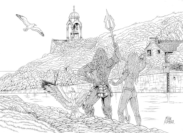 Mon illustration représente une scène à Port Dahouët-Notre-Dame, sur la côte bretonne, en clin d'œil à l'affiche que j'ai réalisée pour le Festival d'Erquy 2023, avec le Aquaman-Momoa. Ci-dessous, vous pouvez voir l'esquisse de ce dessin, la version trait sans foncer et la version noir et blanc finale sur laquelle ma coloriste Max a fait la couleur. Elle a également peint l'affiche de 2023. ......................................................................................................................................................................